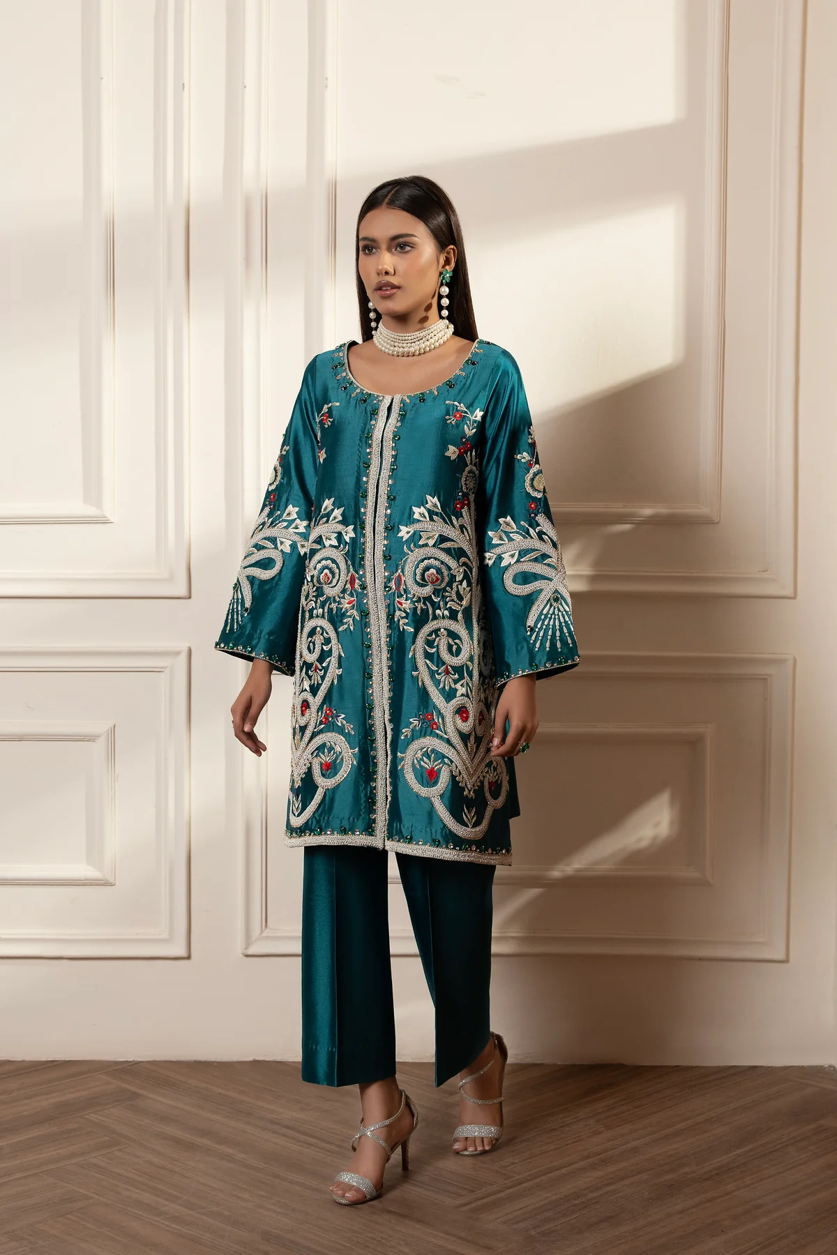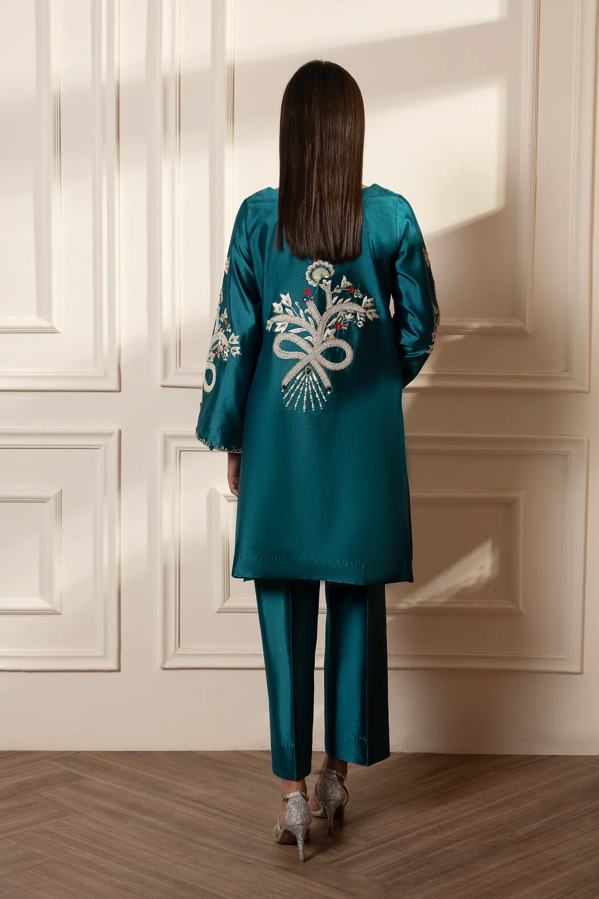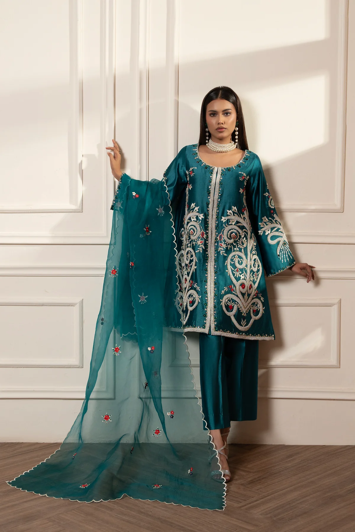 This pure sheesha silk jacket and bootcut pants featuring extensive hand embroidery in Resham Dori and diamonte make this piece exclusive and luxurious. It is embroidered taking inspiration from exclusive jewelry pieces dupatta in purely organza.